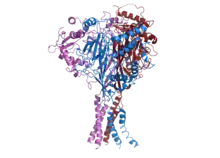 The epithelial sodium channel (ENaC), (also known as amiloride-sensitive sodium channel) is a membrane-bound ion channel that is selectively permeable to sodium ions (Na+). It is assembled as a heterotrimer composed of three homologous subunits α or δ, β, and γ,[2] These subunits are encoded by four genes: SCNN1A, SCNN1B, SCNN1G, and SCNN1D. The ENaC is involved primarily in the reabsorption of sodium ions at the collecting ducts of the kidney's nephrons. In addition to being implicated in diseases where fluid balance across epithelial membranes is perturbed, including pulmonary edema, cystic fibrosis, COPD and COVID-19, proteolyzed forms of ENaC function as the human salt taste receptor.[3]