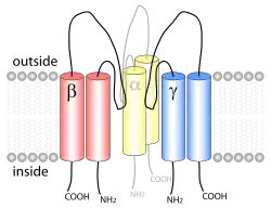 ENaC consists of three different subunits: α, β, γ.[2][15] All three subunits are essential for transport to the membrane assembly of functional channels on the membrane.[16] The C-terminus of each ENaC subunit contains a PPXY motif which when mutated or deleted in either the β- or γ-ENaC subunit leads to Liddle's syndrome, a human autosomal dominant form of hypertension. The cryoEM structure of ENaC indicates that the channel is a heterotrimeric protein like the acid-sensing ion channel 1 (ASIC1), which belongs to the same family.[17][18] Each of the subunits consists of two transmembrane helices and an extracellular loop. The amino- and carboxy-termini of all three polypeptides are located in the cytosol.