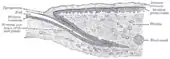 ![]() Longitudinal section through nail and its nail groove (sulcus). | |