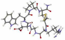 Eptifibatide (Integrilin, Millennium Pharmaceuticals, also co-promoted by Schering-Plough/Essex), is an antiplatelet drug of the glycoprotein IIb/IIIa inhibitor class.[1] Eptifibatide is a cyclic heptapeptide derived from a disintegrin protein (P22827) found in the venom of the southeastern pygmy rattlesnake (Sistrurus miliarius barbouri). It belongs to the class of the arginin-glycin-aspartat-mimetics and reversibly binds to platelets. Eptifibatide has a short half-life. The drug is the third inhibitor of GPIIb/IIIa that has found broad acceptance after the specific antibody abciximab and the non-peptide tirofiban entered the global market.