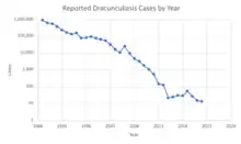 Dracunculiasis, or Guinea worm disease, is an infection by the Guinea worm.[1] In 1986, there were an estimated 3.5 million cases of Guinea worm in 20 endemic nations in Asia and Africa.[2] Ghana alone reported 180,000 cases in 1989. The number of cases has since been reduced by more than 99.999% to 22 in 2015[3] in the five remaining endemic nations of Africa: South Sudan, Chad, Mali, Ethiopia, and Angola.