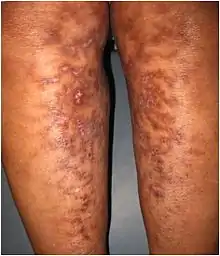 Erythema ab igne (Latin for 'redness from fire') EAI, also known as hot water bottle rash,[2] is a skin condition caused by long-term exposure to heat (infrared radiation).[3] Prolonged thermal radiation exposure to the skin can lead to the development of reticulated erythema, hyperpigmentation, scaling, and telangiectasias in the affected area. Some people may complain of mild itchiness and a burning sensation, but often, unless a change in pigmentation is seen, it can go unnoticed.