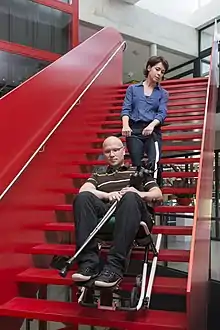 A stair chair has caterpillar tracks for moving a person down the stairs. Operating a stair chair over a flat surface is identical to operating a wheelchair: the operator simply pushes it in front of them. Once the stairwell has been reached, the chair can be pushed back to engage the tracks on the treads of the stairs. There is an extendable handle to allow the operator to control the chair. Enhanced models can require two-person operation; these are more commonly used in ambulances. Escape chairs are produced in both manual and electric versions. Chairs with electrical track systems can be more easily moved up and down stairs by a single operator.[1]