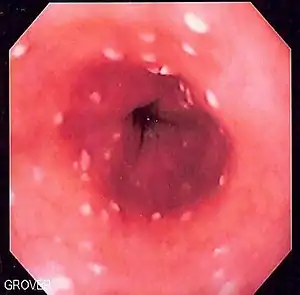 Esophageal candidiasis is an opportunistic infection of the esophagus by Candida albicans. The disease usually occurs in patients in immunocompromised states, including post-chemotherapy and in AIDS. However, it can also occur in patients with no predisposing risk factors, and is more likely to be asymptomatic in those patients.[1] It is also known as candidal esophagitis or monilial esophagitis.