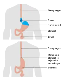 After surgery, patients may have trouble with a regular diet and may have to consume softer foods, avoid liquids at meals, and stay upright for 1–3 hours after eating. Dysphagia is common and patients are encouraged to chew foods very well or grind their food. Patients may complain of substernal pain that resolves by sipping fluids or regurgitating food. Reflux-type symptoms can be severe, including intolerance to acidic foods and large, fatty meals. Jejunal feeding tubes may be placed during surgery to provide a temporary route of nutrition until oral eating resumes.