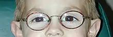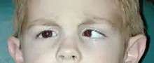Esotropia is a form of strabismus in which one or both eyes turns inward. The condition can be constantly present, or occur intermittently, and can give the affected individual a "cross-eyed" appearance.[1] It is the opposite of exotropia and usually involves more severe axis deviation than esophoria. Esotropia is sometimes erroneously called "lazy eye", which describes the condition of amblyopia; a reduction in vision of one or both eyes that is not the result of any pathology of the eye and cannot be resolved by the use of corrective lenses. Amblyopia can, however, arise as a result of esotropia occurring in childhood: In order to relieve symptoms of diplopia or double vision, the child's brain will ignore or "suppress" the image from the esotropic eye, which when allowed to continue untreated will lead to the development of amblyopia. Treatment options for esotropia include glasses to correct refractive errors (see accommodative esotropia below), the use of prisms, orthoptic exercises, or eye muscle surgery. The term is from Greek eso meaning "inward" and trope meaning "a turning".[2]