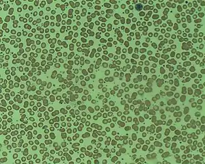 In ET, megakaryocytes are more sensitive to growth factors.[5] Platelets derived from the abnormal megakaryocytes are activated, which, along with the elevated platelet count, contributes to the likelihood of forming blood clots.[6] The increased possibility of bleeding when the platelet count is over 1 million is due to von Willebrand factor (vWF) sequestration by the increased mass of platelets, leaving insufficient vWF for platelet adhesion.[6] A mutation in the JAK2 kinase (V617F) is present in 40–50% of cases and is diagnostic if present.[1][6] JAK2 is a member of the Janus kinase family.[1][6]
