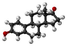 Estrone (E1), also spelled oestrone, is a steroid, a weak estrogen, and a minor female sex hormone.[1] It is one of three major endogenous estrogens, the others being estradiol and estriol.[1] Estrone, as well as the other estrogens, are synthesized from cholesterol and secreted mainly from the gonads, though they can also be formed from adrenal androgens in adipose tissue.[2] Relative to estradiol, both estrone and estriol have far weaker activity as estrogens.[1] Estrone can be converted into estradiol, and serves mainly as a precursor or metabolic intermediate of estradiol.[1][3] It is both a precursor and metabolite of estradiol.[4][1]