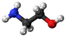 7NO.[8] The molecule is bifunctional, containing both a primary amine and a primary alcohol. Ethanolamine is a colorless, viscous liquid with an odor reminiscent of ammonia.[9] ETA molecules are a component in the formation of cellular membranes and are thus a molecular building block for life. It was thought to exist only on Earth and on certain asteroids, but in 2021 evidence was found that ETA molecules exist in interstellar space.[10]