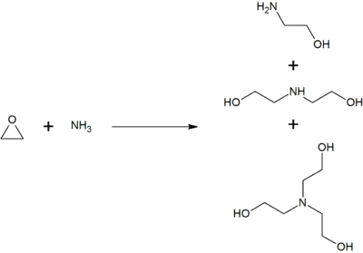 Monoethanolamine is produced by treating ethylene oxide with aqueous ammonia; the reaction also produces diethanolamine and triethanolamine. The ratio of the products can be controlled by the stoichiometry of the reactants.[14]