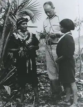The idea of ethnobotany was first proposed by the early 20th century botanist John William Harshberger.[6] While Harshberger did perform ethnobotanical research extensively, including in areas such as North Africa, Mexico, Scandinavia, and Pennsylvania,[6] it was not until Richard Evans Schultes began his trips into the Amazon that ethnobotany became a more well known science.[7] However, the practice of ethnobotany is thought to have much earlier origins in the first century AD when a Greek physician by the name of Pedanius Dioscorides wrote an extensive botanical text detailing the medical and culinary properties of "over 600 mediterranean plants" named De Materia Medica.[2] Historians note that Dioscorides wrote about traveling often throughout the Roman empire, including regions such as "Greece, Crete, Egypt, and Petra",[8] and in doing so obtained substantial knowledge about the local plants and their useful properties. European botanical knowledge drastically expanded once the New World was discovered due to ethnobotany. This expansion in knowledge can primarily be attributed to the substantial influx of new plants from the Americas, including crops such as potatoes, peanuts, avocados, and tomatoes.[9] The French explorer Jacques Cartier learned a cure for scurvy (a tea made from the needles of a coniferous tree, likely spruce) from a local Iroquois tribe.[10]