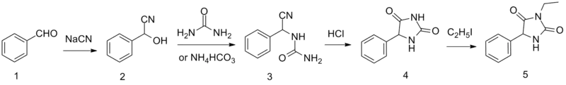 Ethotoin, 3-ethyl-5-phenylimidazolidine-2,4-dione, is synthesized by the reaction of benzaldehyde oxynitrile, with urea or ammonium hydrocarbonate, which forms an intermediate urea derivative which on acidic conditions cyclizes to 5-phenylhydantoin. Alkylation of this product using ethyliodide leads to the formation of ethotoin.