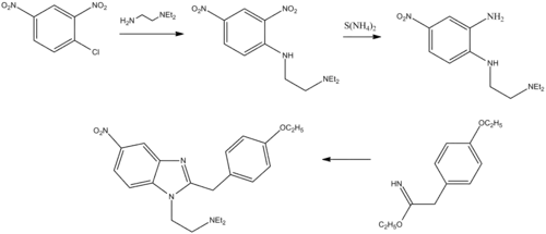 The most versatile synthesis[5] developed by the Swiss team first involved alkylation of 2,4-dinitrochlorobenzene with 1-amino-2-diethylaminoethane to form N-(β-Diethylaminoethyl)-2,4-dinitroaniline [aka: N'-(2,4-Dinitrophenyl)-N,N-diethyl-ethane-1,2-diamine]. The 2-nitro substituent o n the 2,4-dinitroaniline compound is then selectively reduced to the corresponding primary amine by utilizing ammonium sulfide as the reducing agent. The ammonium sulfide can be formed in situ by the addition of concentrated aqueous ammonium hydroxide followed by saturation of the solution with hydrogen sulfide gas. The intermediate formed by the selective reduction of the 2-nitro substituent, 2-(β-Diethylaminoethylamino)-5-nitroaniline, is then reacted with the hydrochloride salt of the imino ethyl ether of 4-ethoxyphenylacetonitrile (aka: p-ethoxybenzyl cyanide). The imino ether, 2-(4-Ethoxyphenyl)-acetimidic acid ethyl ester hydrochloride, is prepared by dissolving the 4-substituted benzyl cyanide in a mixture of anhydrous ethanol and chloroform and then saturating this solution with dry hydrogen chloride gas. The reaction between the 2-(β-dialkylaminoalkylamine)-5-nitroaniline and the HCl salt of the imino ethyl ether results in the formation of etonitazene. This procedure is particularly useful in the preparation of the 4-, 5-, 6-, and 7-nitrobenzimidazoles. Varying the choice of the substituted phenylacetic acid imino ether affords compounds with a diversity of substituents on the benzene ring at the 2- position. A diagram of this particular synthesis as it applies to the preparation of etonitazene is shown below.[4]