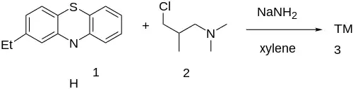 Sodamide Sn2 alkylation between 2-ethylphenothiazine [61852-27-5] (1) and 1-dimethylamino-2-methyl-3-chloropropane [23349-86-2] (2) furnishes the Etymemazine (3).