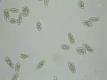 Euglena gracilis is a freshwater species of single-celled alga in the genus Euglena. It has secondary chloroplasts, and is a mixotroph able to feed by photosynthesis or phagocytosis. It has a highly flexible cell surface, allowing it to change shape from a thin cell up to 100 µm long, to a sphere of approximately 20 µm. Each cell has two flagella, only one of which emerges from the flagellar pocket (reservoir) in the anterior of the cell, and can move by swimming, or by so-called "euglenoid" movement across surfaces. E. gracilis has been used extensively in the laboratory as a model organism, particularly for studying cell biology and biochemistry.[3]