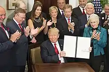 Following the failure of Congress to repeal the ACA through legislation, Trump issued the new order. Both supporters and critics asserted that the provisions of the order were intended to redefine the American health care market and effectively replace Obamacare with a new health care regime.[4][33] Trump briefly forgot to sign the order before leaving the signing ceremony, but was ushered back to the table by Vice President Mike Pence to complete this step.[34] Senator Rand Paul, who attended the signing, described the order as "the biggest free market reform of health care in a generation."[33]