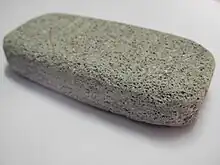 Pumice, which is an igneous rock that is composed of solidified lava that rapidly cools with gas bubbles being trapped inside of it, is commonly used as an exfoliating material.[15] Pumice is a decently abrasive material, making it useful as an exfoliating agent.[15]