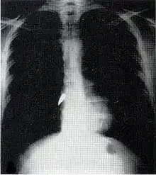 Most penetrating injuries are chest wounds and have a mortality rate (death rate) of under 10%.[14] Penetrating chest trauma can injure vital organs such as the heart and lungs and can interfere with breathing and circulation. Lung injuries that can be caused by penetrating trauma include pulmonary laceration (a cut or tear) pulmonary contusion (a bruise), hemothorax (an accumulation of blood in the chest cavity outside of the lung), pneumothorax (an accumulation of air in the chest cavity) and hemopneumothorax (accumulation of both blood and air). Sucking chest wounds and tension pneumothorax may result.