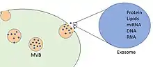 Exosomes can transfer molecules from one cell to another via membrane vesicle trafficking, thereby influencing the immune system, such as dendritic cells and B cells, and may play a functional role in mediating adaptive immune responses to pathogens and tumors.[24][25] Therefore, scientists who are actively researching the role that exosomes may play in cell-to-cell signaling, often hypothesize that delivery of their cargo RNA molecules can explain biological effects. For example, mRNA in exosomes has been suggested to affect protein production in the recipient cell.[21][26][27] However, another study has suggested that miRNAs in exosomes secreted by mesenchymal stem cells (MSC) are predominantly pre- and not mature miRNAs.[28] Because the authors of this study did not find RNA-induced silencing complex-associated proteins in these exosomes, they suggested that only the pre-miRNAs, but not the mature miRNAs in MSC exosomes, have the potential to be biologically active in the recipient cells. Multiple mechanisms have been reported to be involved in loading miRNAs into exosomes, including specific motifs in the miRNA sequences, interactions with lncRNAs localized to the exosomes, interactions with RBPs, and post-translational modifications of Ago.[29]