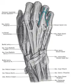 An extensor expansion (extensor hood,[1] dorsal expansion, dorsal hood, dorsal aponeurosis) is the special connective attachments by which the extensor tendons insert into the phalanges.