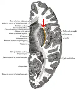 Horizontal section of right cerebral hemisphere. (external capsule shown in orange, indicated by red arrow.)