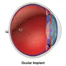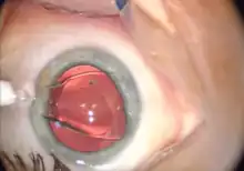 Posterior capsular rupture, a tear in the posterior capsule of the natural lens, is the most-common complication during cataract surgery, with a rate of around 0.5% to 5.2%.[2] Surgical management may involve anterior vitrectomy and occasionally, alternative planning for implanting the IOL, either in the ciliary sulcus—the space between the iris and the ciliary body—in the anterior chamber in front of the iris, or less commonly, sutured to the sclera. Posterior capsule rupture can cause lens fragments to be retained, corneal oedema, and cystoid macular oedema; it is also associated with a six-times increase of risk of endophthalmitis and as much as 19 times increase in the risk of retinal detachment.[2][70] Management methods include the Intraocular lens scaffold procedure.[71]