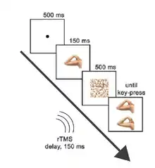 The actual experiment had people make a “two-choice matching-to-sample task. Fourteen right handed participants were required to decide which of two similar upper-limb images matched a single sample previously seen during a tachistoscopic exposure. Photos of face parts and motorcycle parts served as control stimuli in two-matching-to-sample tasks that were comparable to the former task.”[5] rTMS was then applied 150 ms after each sample exposure. The section of the graph, Body Parts, shows the response time while using rTMS. The SHAM category refers to measuring the EBA without rTMS while viewing the images. The Visual Cortex category measures the response of the FFA to be used as the control of the experiment. This measurement of response time, occurring while rTMS was effecting the EBA, further shows that the two areas process visual data of the human form, yet respond to different stimuli. While the magnetic stimulation was temporarily disabling the extrastraite body area, reaction time decreased by about 100 ms. The data from the Sham and Visual Cortex categories on the graph show what was the expected normal results from the experiment. This evidence reveals that applying rTMS to the EBA slowed the response of recognizing images of body parts.[5]