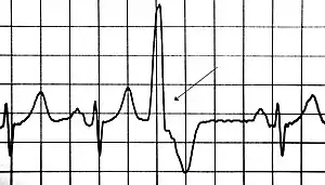 A premature heart beat or extrasystole[1] is a heart rhythm disorder corresponding to a premature contraction of one of the chambers of the heart. Premature heart beats come in two different types: premature atrial contractions and premature ventricular contractions. Often they cause no symptoms but may present with fluttering in the chest or a skipped beat. They typically have no long term complications.