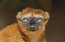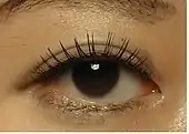 Almost all mammals have brown or darkly-pigmented irises.[24] In humans, brown is by far the most common eye color, with approximately 79% of people in the world having it.[25] Brown eyes result from a relatively high concentration of melanin in the stroma of the iris, which causes light of both shorter and longer wavelengths to be absorbed.[26]