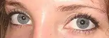 Heterochromia (heterochromia iridum or heterochromia iridis) is an eye condition in which one iris is a different color from the other (complete heterochromia), or where a part of one iris is a different color from the remainder (partial heterochromia or sectoral heterochromia). It is a result of the relative excess or lack of pigment within an iris or part of an iris, which may be inherited or acquired by disease or injury.[83] This uncommon condition usually results due to uneven melanin content. A number of causes are responsible, including genetic, such as chimerism, Horner's syndrome and Waardenburg syndrome.
