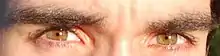 Hazel eyes are due to a combination of Rayleigh scattering and a moderate amount of melanin in the iris' anterior border layer.[4][33] Hazel eyes often appear to shift in color from a brown to a green. Although hazel mostly consists of brown and green, the dominant color in the eye can either be brown/gold or green. This is why hazel eyes can be mistaken as amber and vice versa.[36][37][38][39][40][41][42] The combination can sometimes produce a multicolored iris, i.e., an eye that is light brown/amber near the pupil and charcoal or dark green on the outer part of the iris (or vice versa) when observed in sunlight.