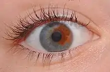 An example of sectoral heterochromia. The subject has a blue iris with a brown section.