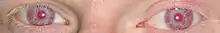 The eyes of people with severe forms of albinism may appear red under certain lighting conditions owing to the extremely low quantities of melanin,[67] allowing the blood vessels to show through. In addition, flash photography can sometimes cause a "red-eye effect", in which the very bright light from a flash reflects off the retina, which is abundantly vascular, causing the pupil to appear red in the photograph.[68]