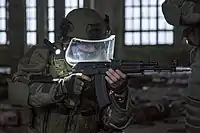 Russian paratrooper with a 6B47 helmet and ballistic face shield
