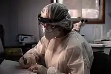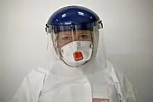 A face shield, an item of personal protective equipment (PPE), aims to protect the wearer's entire face (or part of it) from hazards such as flying objects and road debris, chemical splashes (in laboratories or in industry), or potentially infectious materials (in medical and laboratory environments). Depending on the type used, a face shield may protect its wearer from a physical hazard, chemical splashes, or biological hazards. [1]