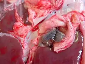 The development of infection in definitive host is divided into two phases: the parenchymal (migratory) phase and the biliary phase.[16] The parenchymal phase begins when excysted juvenile flukes penetrate the intestinal wall. After the penetration of the intestine, flukes migrate within the abdominal cavity and penetrate the liver or other organs. F. hepatica has a strong predilection for the tissues of the liver.[17] Occasionally, ectopic locations of flukes such as the lungs, diaphragm, intestinal wall, kidneys, and subcutaneous tissue can occur.[24][32] During the migration of flukes, tissues are mechanically destroyed and inflammation appears around migratory tracks of flukes. The second phase (the biliary phase) begins when parasites enter the biliary ducts of the liver. In biliary ducts, flukes mature, feed on blood, and produce eggs. Hypertrophy of biliar ducts associated with obstruction of the lumen occurs as a result of tissue damage.