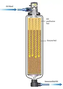 The most common industrial EIE process forces the liquid fat feedstock through a fixed-bed reactor, that typically contains an oil purification bed followed by an enzyme bed. The latter has the enzyme fixed on some inert granular substrate. The first bed removes impurities from the oil blend that could inactivate the enzyme or affect its performance. The enzyme activity decreases over time, so flow must be carefully monitored and adjusted over time to maintain conversion. [5]