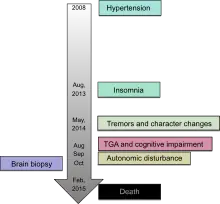 The age of onset is variable, ranging from 13 to 60 years, with an average of 50.[8] The disease can be detected prior to onset by genetic testing.[9] Death usually occurs between 6–36 months from onset. The presentation of the disease varies considerably from person to person, even among people within the same family; in the sporadic form, for example, sleep problems are not commonly reported and early symptoms are ataxia, cognitive impairment, and double vision.[10]