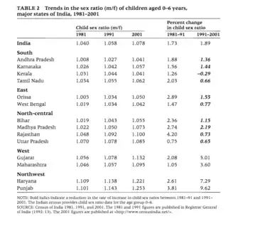 The following table presents the child sex ratio data for India's states and union territories, according to 2011 Census of India for population count in the 0-1 age group.[36] The data suggests 18 states/UT had birth sex ratio higher than 107 implying excess males at birth and/or excess female mortalities after birth but before she reaches the age of 1, 13 states/UT had normal child sex ratios in the 0-1 age group, and 4 states/UT had birth sex ratio less than 103 implying excess females at birth and/or excess male mortalities after birth but before he reaches the age of 1.