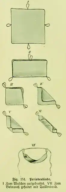 Sanitary napkins could be made of woven cotton, knitted or crocheted and filled with rags.[35] They could be homemade for personal use or mass-produced and sold, such as in towns that had a textile industry.[36]