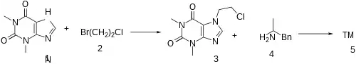 Theophylline (1) is allowed to react with 2-bromochloroethane (2) by refluxing both compounds at 90°C for 18h. The produced 7-(2-Chloroethyl)theophylline (3) is filtration and purificated. After purification, compound 3 is mixed with amphetamine (4) in a mixture at 100°C for 17 hours to produce fenethylline (5)[67].