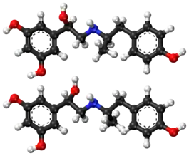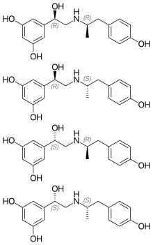 5-(1-Hydroxy-2-{[2-(4-hydroxyphenyl)-1-methylethyl]amino}ethyl)benzene-1,3-diol is a molecule with two different stereogenic centers. Thus, four stereoisomers may exist, the (R,R)-, (R,S)-, (S,R)- and (S,S)-stereoisomers (see the figure below). Fenoterol is a racemate of the (R,R)- and the (S,S)-enantiomers. This racemate is 9 to 20 times more effective, as compared to the racemate of the (R,S)- and (S,R)-enantiomers.[14]