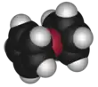 In hexaferrocenylbenzene, C6[(η5-C5H4)Fe(η5-C5H5)]6, all six positions on a benzene molecule have ferrocenyl substituents (R).[81] X-ray diffraction analysis of this compound confirms that the cyclopentadienyl ligands are not co-planar with the benzene core but have alternating dihedral angles of +30° and −80°. Due to steric crowding the ferrocenyls are slightly bent with angles of 177° and have elongated C-Fe bonds. The quaternary cyclopentadienyl carbon atoms are also pyramidalized. Also, the benzene core has a chair conformation with dihedral angles of 14° and displays bond length alternation between 142.7 pm and 141.1 pm, both indications of steric crowding of the substituents.