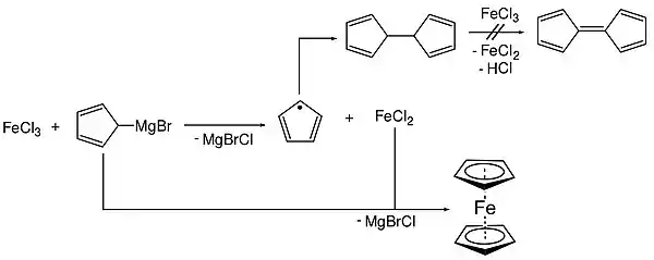The first reported syntheses of ferrocene were nearly simultaneous. Pauson and Kealy synthesised ferrocene using iron(III) chloride and a Grignard reagent, cyclopentadienyl magnesium bromide. Iron(III) chloride is suspended in anhydrous diethyl ether and added to the Grignard reagent.[12] A redox reaction occurs, forming the cyclopentadienyl radical and iron(II) ions. Dihydrofulvalene is produced by radical-radical recombination while the iron(II) reacts with the Grignard reagent to form ferrocene. Oxidation of dihydrofulvalene to fulvalene with iron(III), the outcome sought by Kealy and Pauson, does not occur.[9]