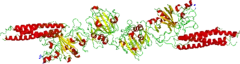 Fibrin is formed after thrombin cleavage of fibrinopeptide A (FPA) from fibrinogen Aalpha-chains, thus initiating fibrin polymerization. Double-stranded fibrils form through end-to-middle domain (D:E) associations, and concomitant lateral fibril associations and branching create a clot network.[5][6] Fibrin assembly facilitates intermolecular antiparallel C-terminal alignment of gamma-chain pairs, which are then covalently 'cross-linked' by factor XIII ('plasma protransglutaminase') or XIIIa to form 'gamma-dimers'. The image at the left is a crystal structure of the double-d fragment from human fibrin with two bound ligands. The experimental method used to obtain the image was X-ray diffraction, and it has a resolution of 2.30 Å. The structure is mainly made up of single alpha helices shown in red and beta sheets shown in yellow. The two blue structures are the bound ligands. The chemical structures of the ligands are Ca2+ ion, alpha-D-mannose (C6H12O6), and D-glucosamine (C6H13NO5).[7]