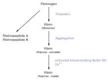 Fibrin (also called Factor Ia) is a fibrous, non-globular protein involved in the clotting of blood. It is formed by the action of the protease thrombin on fibrinogen, which causes it to polymerize. The polymerized fibrin, together with platelets, forms a hemostatic plug or clot over a wound site.