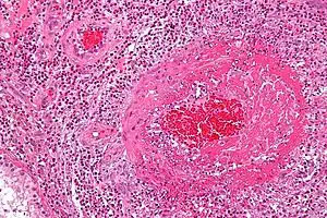Fibrinoid necrosis is a specific pattern of irreversible, uncontrolled cell death that occurs when antigen-antibody complexes are deposited in the walls of blood vessels along with fibrin. It is common in the immune-mediated vasculitides which are a result of type III hypersensitivity. When stained with hematoxylin and eosin, they appear brightly eosinophilic and smudged.[1]