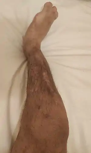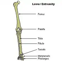 Fibular hemimelia or longitudinal fibular deficiency is "the congenital absence of the fibula and it is the most common congenital absence of long bone of the extremities."[1][2] It is the shortening of the fibula at birth, or the complete lack thereof. Fibular hemimelia often causes severe knee instability due to deficiencies of the ligaments. Severe forms of fibula hemimelia can result in a malformed ankle with limited motion and stability. Fusion or absence of two or more toes are also common.[3] In humans, the disorder can be noted by ultrasound in utero to prepare for amputation after birth or complex bone lengthening surgery. The amputation usually takes place at six months with removal of portions of the legs to prepare them for prosthetic use. The other treatments, which include repeated corrective osteotomies and leg-lengthening surgery (Ilizarov apparatus), are costly and associated with residual deformity.[4]