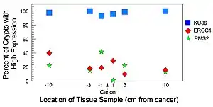 The diagram shows results obtained by Facista et al.[22] A particular colon resection from a colon cancer patient was evaluated for expression of 3 different DNA repair enzymes: Ku86 (active in the non-homologous end joining pathway), ERCC1 (active in the nucleotide excision DNA repair pathway) and PMS2 (active in the mismatch DNA repair pathway). The percent of crypts in 6 tissue samples taken within the field defect were evaluated for frequency of high levels of expression of each of the repair proteins. Almost every crypt in all tissue samples from this patient showed high expression of KU86. However, the majority of crypts in all 6 tissue samples were reduced or absent in protein expression of ERCC1 and PMS2. The crypts with reduced or absent expression of ERCC1 or PMS2 usually occurred in large patches of adjacent crypts. Both ERCC1 and PMS2, in these tissue samples, were thought to be deficient due to epigenetic alterations.
