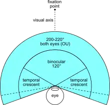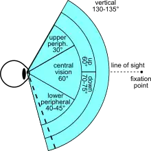 If the analogy of the eye's retina working as a sensor is drawn upon, the corresponding concept in human (and much of animal vision) is the visual field.[3] It is defined as "the number of degrees of visual angle during stable fixation of the eyes".[4] Note that eye movements are excluded in the visual field's definition. Humans have a slightly over 210-degree forward-facing horizontal arc of their visual field (i.e. without eye movements),[5][6] (with eye movements included it is slightly larger, as you can try for yourself by wiggling a finger on the side), while some birds have a complete or nearly complete 360-degree visual field. The vertical range of the visual field in humans is around 150 degrees.[5]